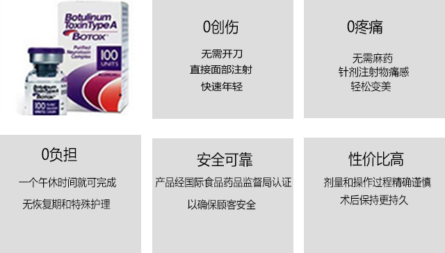 BOTOX微创注射除皱是通过面部注射医学美容填充剂,填充修复皱纹,从而达到祛皱、紧肤的效果,具有微创、快速、无需恢复期等优势,也是众多渴望年轻却又害怕手术的名媛的。